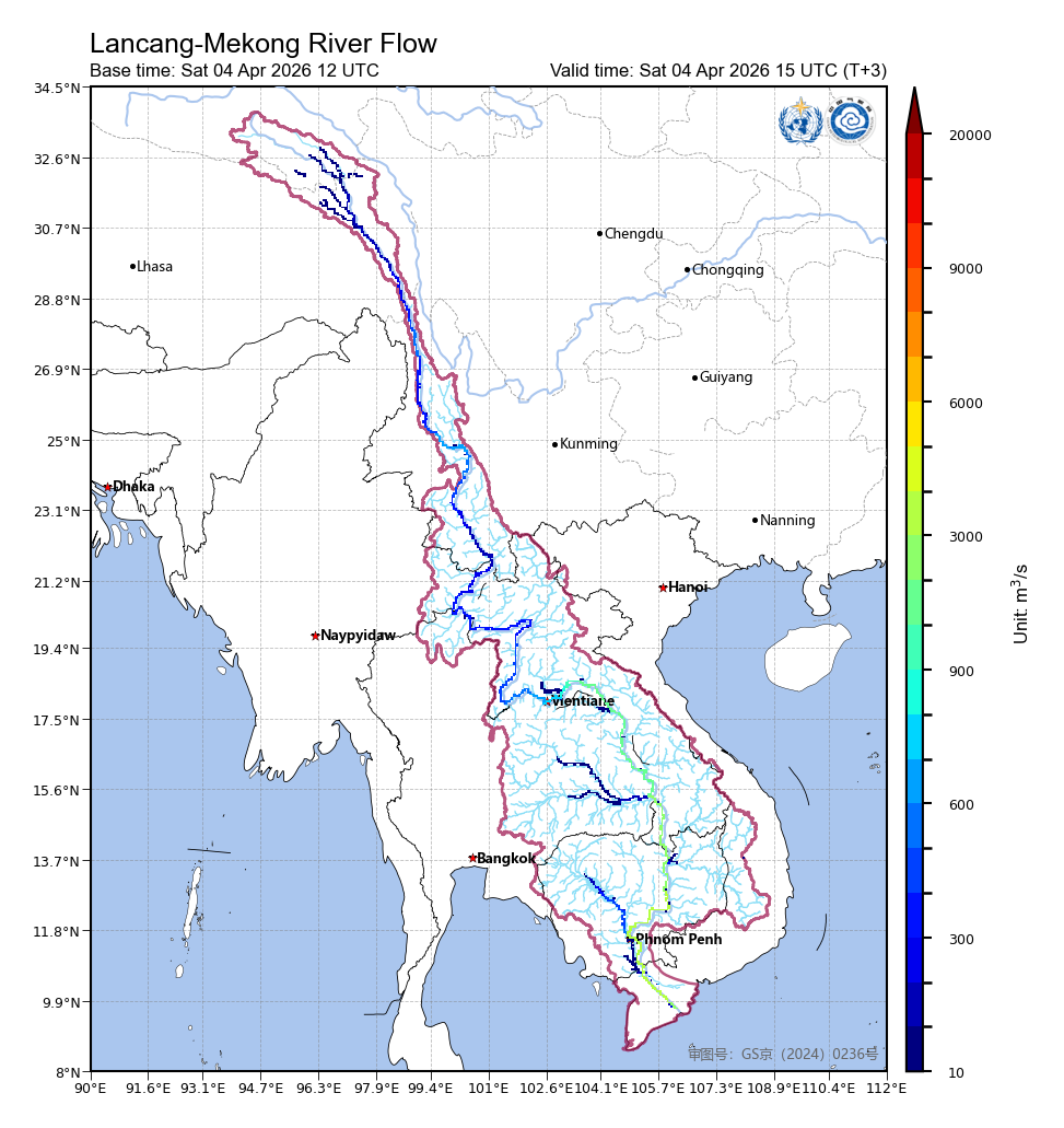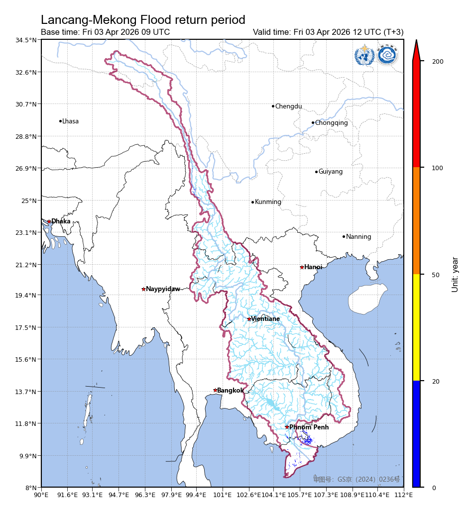 Based on Hydrological Dynamic Model built on the Lancang-Mekong Basin Comprehensive Meteorological Service Sharing Platform, using historical observation data and refined 3-hourly grid forecast data for the next 10 days, obtain 500-meter resolution flood inundation area and depth forecasts, flood return period and critical rainfall to determine flood risk for the next 10 days.